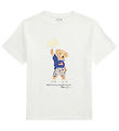 Elegant Polo Ralph Lauren t-shirt in a light cream color. The T-shirt has a nice print on the front, which shows Polo Bear in a city scene with a yellow taxi in the background. The Polo Ralph Lauren t-shirt has a round neckline that is simple and stylish.