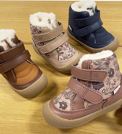 The Wheat winter boots are a low model that goes up to the ankles, and they close with velcro. The Winter boots are lined with warm, white wool, and they have lined, removable insoles. The outer soles are brown and made of flexible rubber, which goes up protectively over the muzzle.