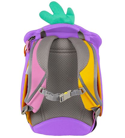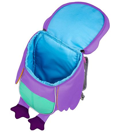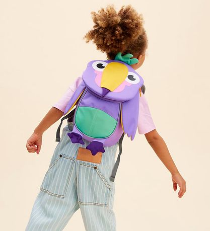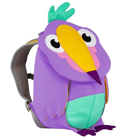 Cute Affenzahn backpack in purple, shaped like a toucan. In front there are two large eyes, a quill and a beak. The beak is attached with an elastic band, and when you pull it, a name tag appears. On the sides there are wings that can be folded out and at the bottom there are small feet.