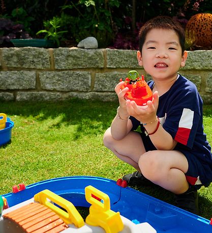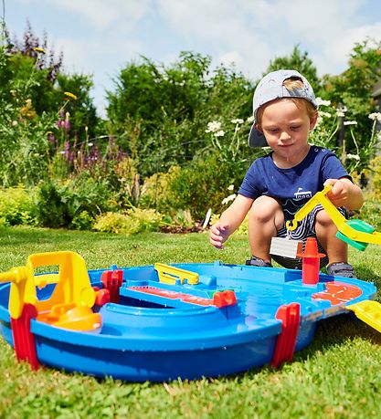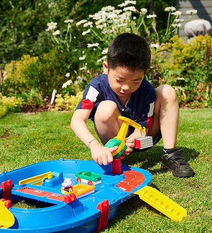 The AquaPlay play set is intended for playing with water. The hippopotamus Wilma controls the port, where containers can be loaded on the boat and in the car. The water channel has a crank so the kid can play with the water and see how it moves.