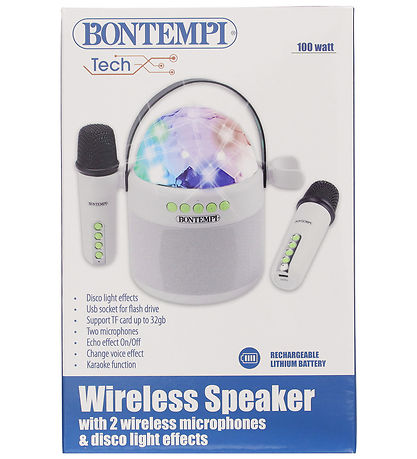 The Bontempi speaker is wireless and compact, making it easy to take on the go. It has a rechargeable lithium battery that charges with the included USB-C cable and a capacity of 100 W.