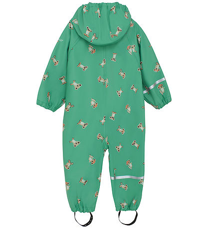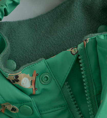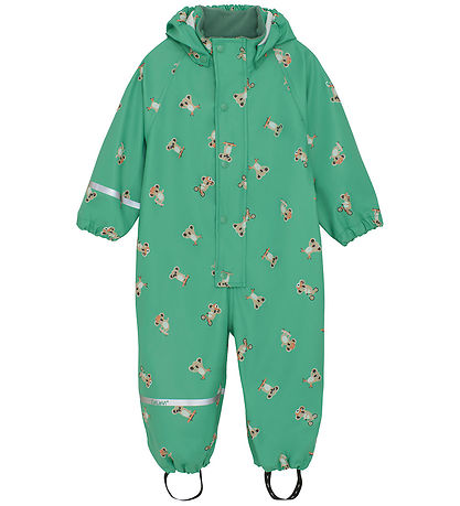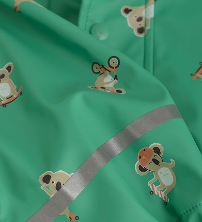 Beautiful CeLaVi rainsuit in green PU with a print of skater koalas.