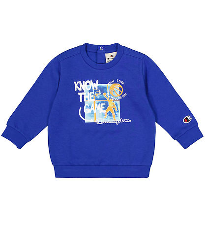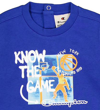 Lovely Champion sweat set in a deep blue shade with a colorful print on the front that includes the text "KNOW THE GAME" and an illustration of basketball on the front of the sweatshirt. The Sweatshirt has long sleeves, a push-botton at the neck and is comfortable to Have. The Trousers have elastic at the waist and can be easily adjusted with drawstring, and both parts of the set have soft, brushed cotton on the inside.