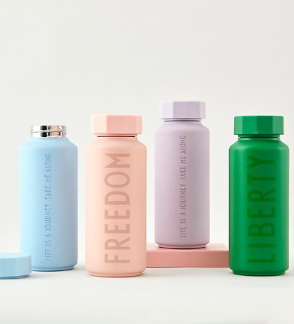 Fine Design Letters thermo bottle in powder with a print of the text "Freedom" written down the bottle.