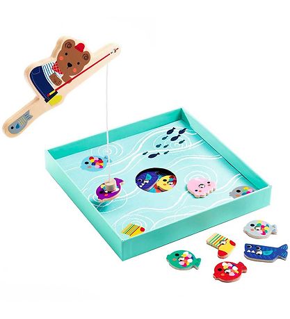 The Djeco fishing toy consists of 12 wood fish with a little magnet, which must be fished out of the box with a fishing rod with a magnet on the fishing hook. As an extra challenge, a plate is placed over the fish so that they are caught blind and pulled towards the center and up a hole.