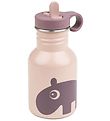 Practical Done by Deer water bottle in transparent plastic, with a pink case and lid. On the front of the case is the elephant Elphee in an elevated quality, and on the back there are cutouts of paws.