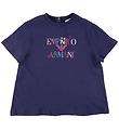 Nice Emporio Armani T-shirt in solid navy. On the front is "Emporio Armani" in small navy sequins.