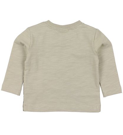 The En Fant blouse has long sleeves and a classic cut. It has a wide ribbed edge around the neck, and hidden push buttons at the left shoulder.