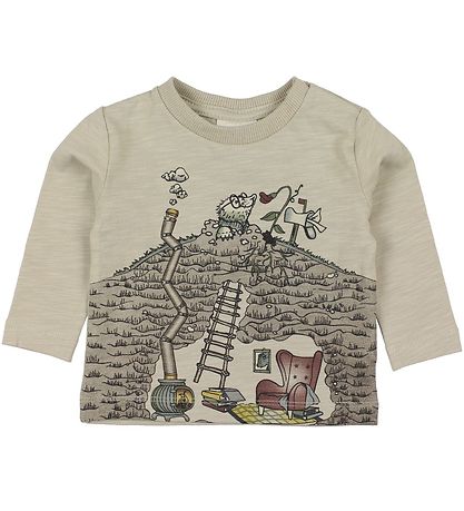 Sweet En Fant blouse in brown melange with a sweet print on the entire front of a human mole home underground. The mole living there is sticking its head out on top and sniffs a flower.
