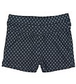 Cool En Fant shorts in plain navy, with a brown patch on the right side of the waist on the back, with the brand's name in black.