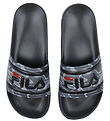 Gorgeous Fila flip flops in black with a camouflage print in shades of grey on the strap and with a black and red logo on the strap.