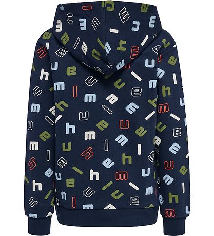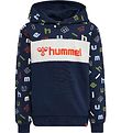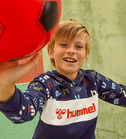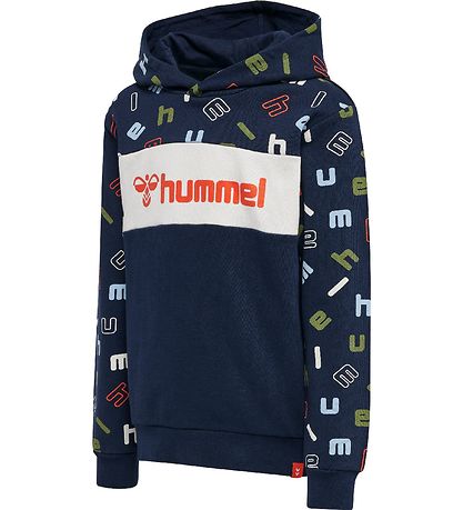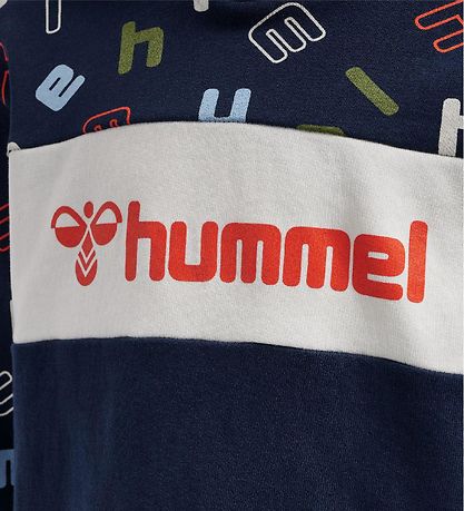 Cool Hummel hoodie in navy blue with a wide, white stripe on the chest, on which is printed "Hummel" in red. The upper set of the shirt has an allover print of the letters from "Hummel" in different colours.
