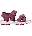 Fine Hummel sandals in dark pink with white Hummel shevrons on the outside and a white logo print on one strap.