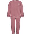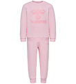 Nice Hummel sweat set set consisting of a sweatshirt and a pair of sweatpants, both parts in pink. The Sweatshirt has a logo and the brand's name embroidered on the left chest, and the same can be found on the left thigh of the sweatpants.