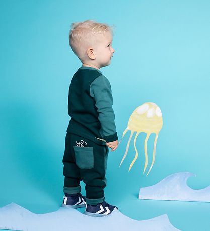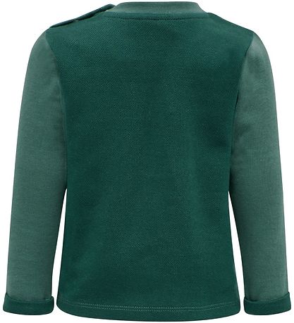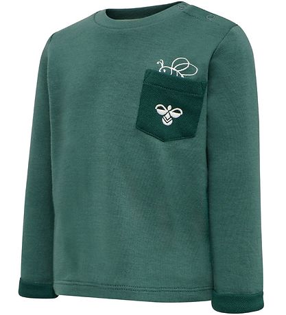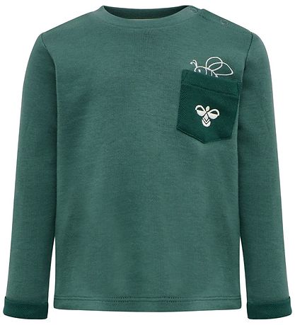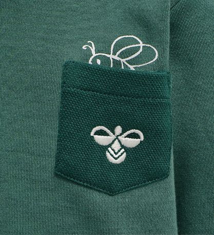 Cute Hummel sweatshirt in dark green, where the chest pocket and the back are a darker green with a different fabric structure. On the pocket is a white, embroidered Hummel bee, and down inside the pocket comes a white bumble bee.