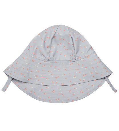 Cute Hust and Claire swim hat in dusty light blue with an allover print of small flowers in white, pink and green.