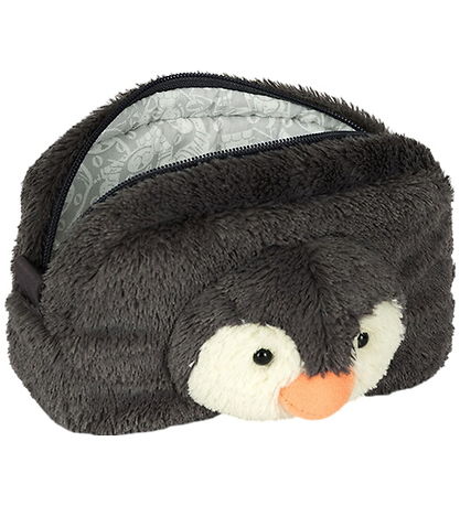 Nice Jellycat bag made of grey plys with a nice penguin on the front. The Jellycat bag consists of one Rum, which opens with a zipper at the top. The inside of the bag is lined with Jellycat logos in grey and white.