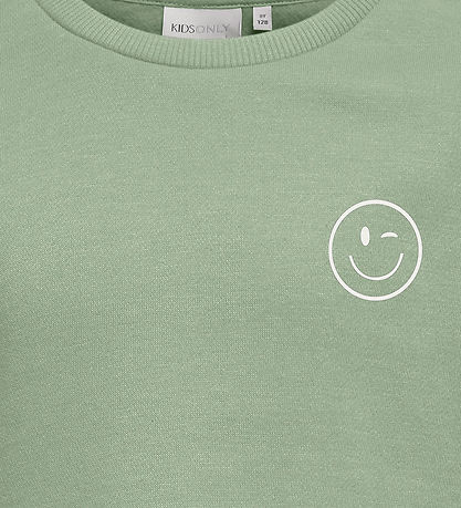 Beautiful Kids Only shorts set in sweat quality. The Set consists of a t-shirt and a pair of shorts in a beautiful, dusty green colour with a print of a white smiley on the left chest and left thigh. The Kids Only t-shirt is a card model with wide, short sleeves and a round neckline with a narrow ribbed edge. The Shorts have a good elastic at the waist, which can be adjusted with buttons inside. At the top there is a pocket on each side. The shorts set has soft, brushed cotton inside.