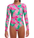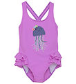 Smart Konges Sløjd swimsuit in check green and white with large ruffle sleeves. It has smock details at the chest and upper back. The Swimsuit has a square neckline and elastic at the leg openings.