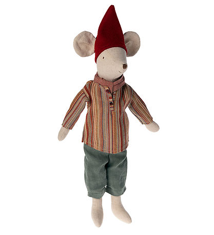 Beautiful Maileg mouse dressed for Christmas with a red and beige striped shirt, a pair of trousers in dusty green and a red christmas hat.