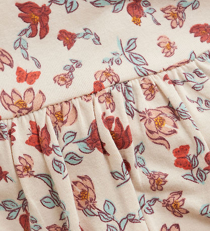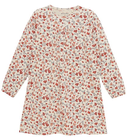 Attractive Minymo nightdress with an inviting design in beige, decorated with a floral pattern in red and blue shades. The Nightdress has long sleeves and a round neckline. The addition of elastic edges at the wrists ensures a proper fit.