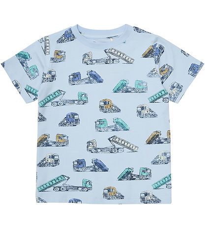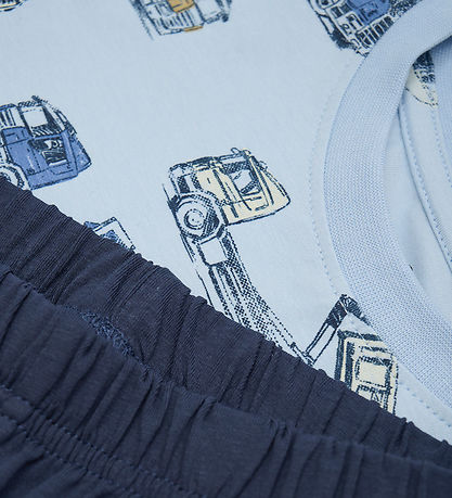 Lovely Minymo shorts set consisting of a light blue t-shirt with an allover print of trucks and a pair of in navy shorts. The T-shirt has short sleeves, making it suitable for warm days. The Shorts have a wide elastic edge around the waist, ensuring a good fit. The shorts set is made of a nice and comfortable cotton quality.