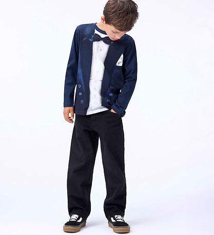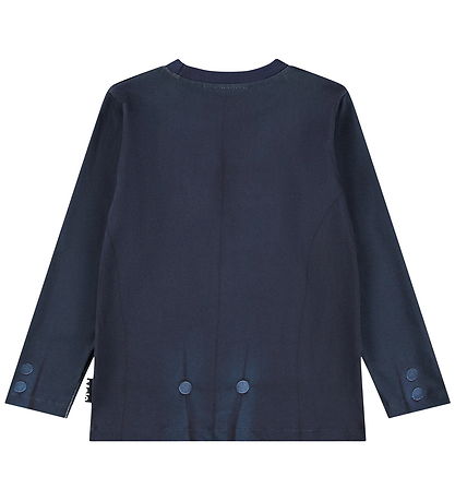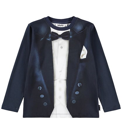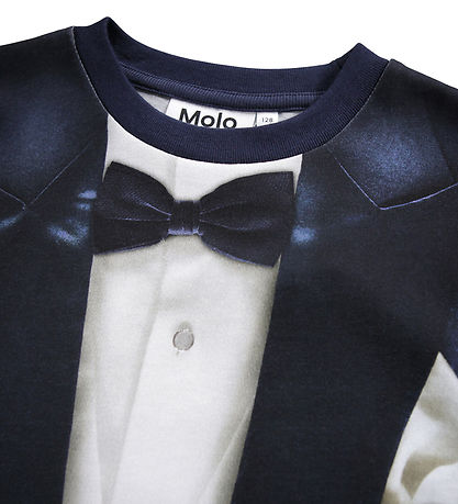 Stylish Molo blouse in dark blue with a unique print, so it looks like the top set of a tuxedo with a white shirt and bow tie.