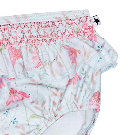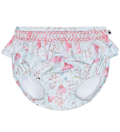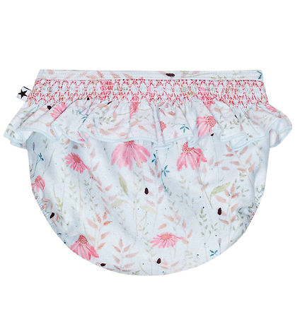 Fine Molo swim trunks in light blue with a pink floral print. The Swim trunks have a wide, elastic waist with a fine ruffle edge. The Swim trunks have elastic in the leg openings and space for a diaper underneath.