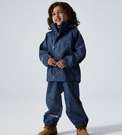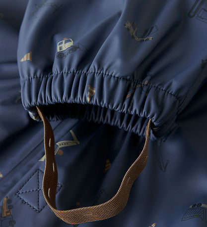 Nice Name It rainwear made of PU consisting of a rain jacket and a pair of rain pants with suspenders in dusty dark blue with an all-over print of work machines.