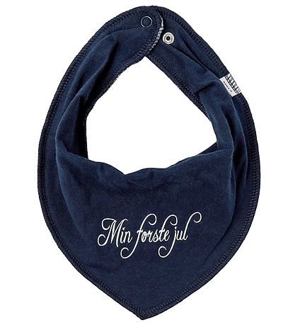 Beautiful Name It teething bib in navy with "My first Christmas" printed in white.