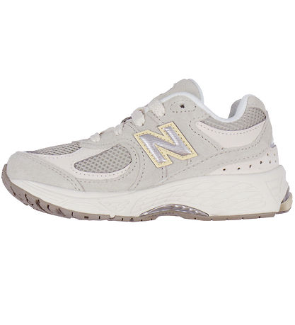 Beautiful New Balance shoes in gray suede and textile with logos on the sides in silver and yellow.