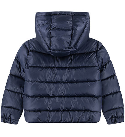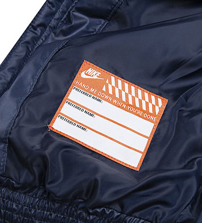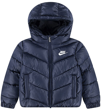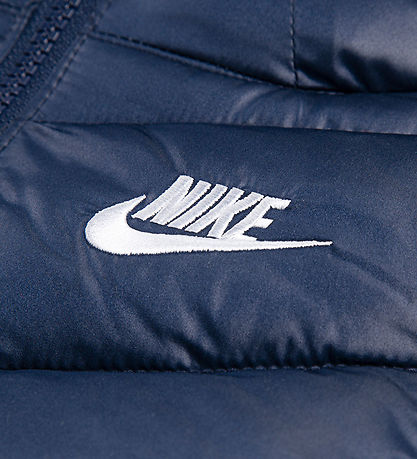 Nice Nike puffer jacket in navy blue with an embroidered white logo on the left chest and slanted seams.