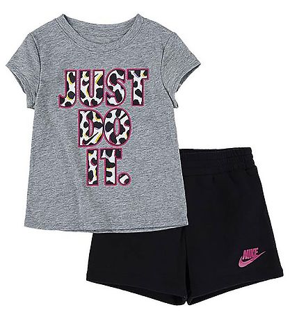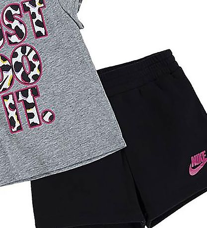 Cool Nike shorts set set consisting of a t-shirt and a pair of sweat shorts. The T-shirt is in melange light grey with a print of the text "JUST DO IT" in a dalmatian- pattern in white, black, yellow, pink, mint and purple and with a pink edge. The Sweat shorts are in black with a pink logo print on the left thigh.