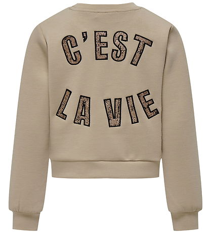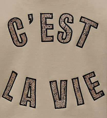 Beautiful blouse from Kids Only in beige with a large print on the back with the text "C'est La Vie" in gold glitter and black. The Blouse has long sleeves and a round neckline. It has wide edges in the sleeve and waist opening and a narrow edge in the neck opening.