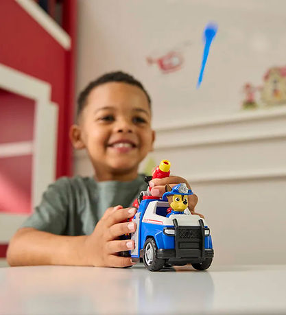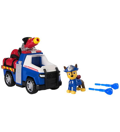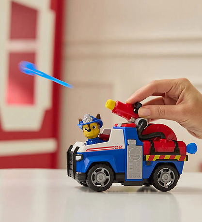 The Paw Patrol car has a large fire hose on the bed and can fire water cannonballs. A Chase figure is also included and can sit in the driver's seat of the car.