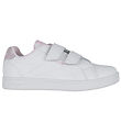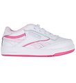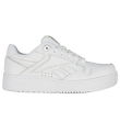 Cool Reebok sneakers in white, imitation leather with "Reebok" standing in black on top of the tongue and outside. On the outside is the classic Reebok logo in black and blue outline. The edge of the opening and the heel cap are blue, and on the heel cap is "Reebok" in white. The "Reebok" also stands on the outsole of the outside back towards the heel.