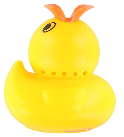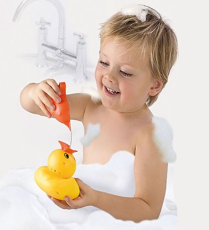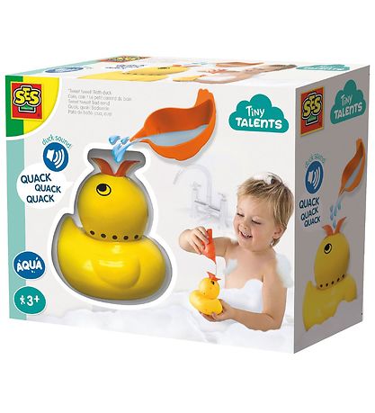 The SES Creative bath toy makes duck sounds when it is put in the water. You have to pour water into it using the bowl provided to make the duck stop making sounds.