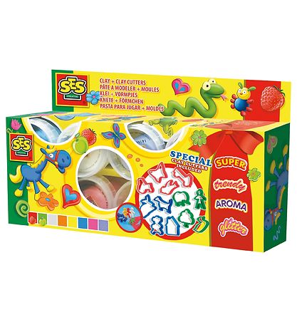 Fun SES Creative creative clay in 8 beautiful colours and with 12 smart extruders in different shapes. The colours of the creative clay are red with the scent of strawberries, green with the scent of apples, purple with mica, white, orange, yellow, blue and pink.