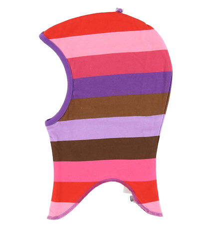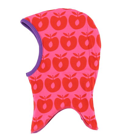 Beautiful Småfolk balaclava in a reversible design with fine stripes in shades of purple, pink, red, brown and purple on one side and red apples on the other side.