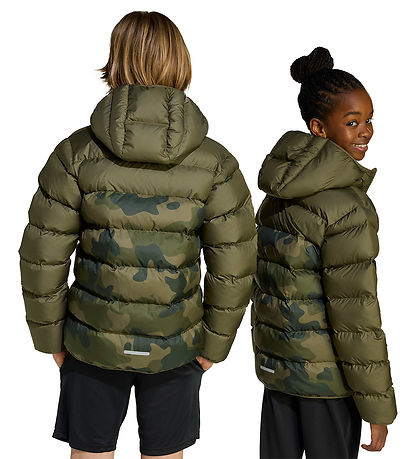 Great adidas Performance puffer jacket in a stylish olive green shade combined with camouflage pattern on the lower panels. It has a simple, embroidered logo on the left chest.