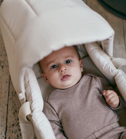 The Copenhagen Colors cap is in a 2 in 1 design. The hood fits the Copenhagen Colors baby lift, and can be used as both hood and seat. The cap is attached to one of the sides of the baby lift with push buttons, and protects the kid from both sun and too many impressions outside. When the kid is old enough, the hood can be turned inside out and the edge buttoned up so that the kid can sit up with support in the lift.
