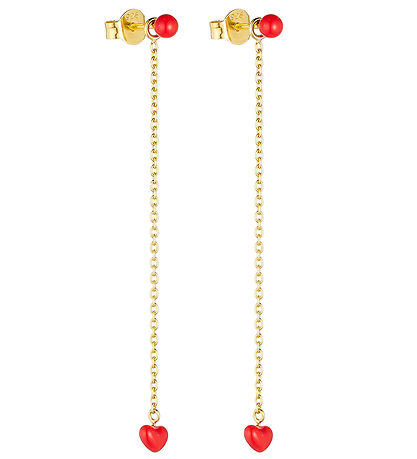 Sweet Design Letters earrings in gold-plated silver with both a red ball at the ear stud and a chain with a red heart at the end.