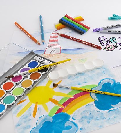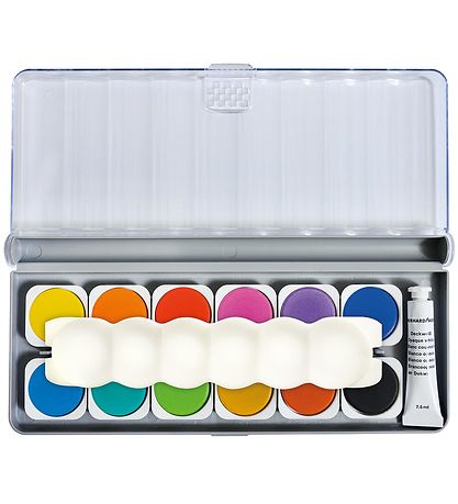 The Eberhard Faber watercolors come in a practical plastic tray, where there is also room to put a brush. With the many colours, the only limit is the imagination. The large box makes it easy to pack up and transport.