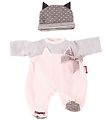 Lovely Götz doll clothes consisting of a jumpsuit in soft, beige knitted with fine, colorful details. The jumpsuit comes with a matching knitted beanie. The Götz jumpsuit has long sleeves and a wrap design with fixed feet. The Jumpsuit can be opened with a practical button.