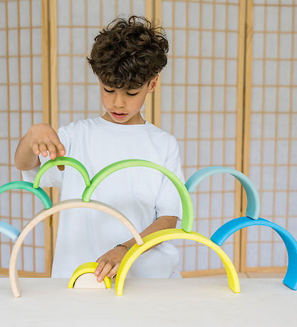 Grimms rainbow consists of 10 arcs that can be put together to form a rainbow, so that the little ones have to find the right order, a bit like a stacking tower. The rainbow is perfect for little ones who are practicing their motor skills and logical sense. When the rainbow is not being played with, it is also a smart decoration in the children's room.
