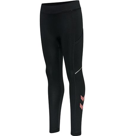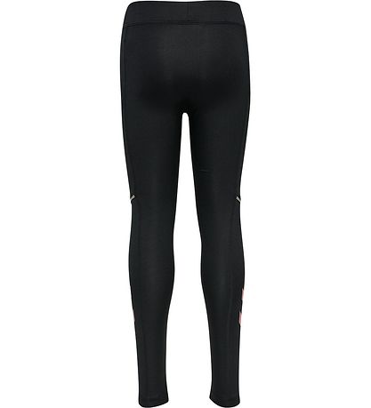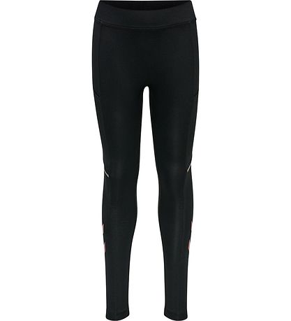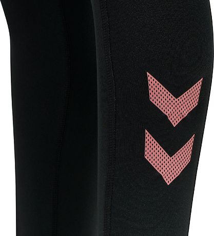 Smart Hummel leggings in black with two pink Hummel- shevrons each trouser leg.