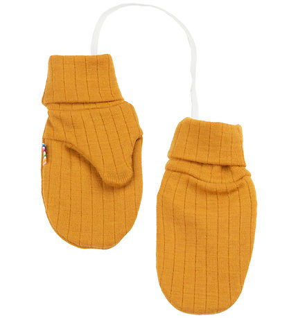 Lovely Joha mittens in a warm mustard yellow shade with a fine ribbed surface.