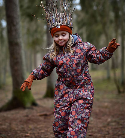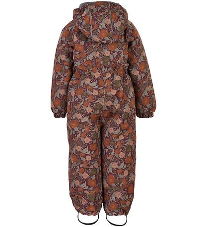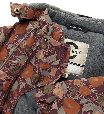 Cool Mikk-Line snowsuit in purple with an all-over floral print in pink, dark orange, green and with gold details. The flight Snowsuit has reflective logos and piping.