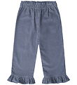 Stylish Molo corduroy trousers in a deep purple shade with a classic velvet texture. The Molo corduroy trousers have a practical, adjustable elastic at the waist and close with a push-botton and zipper at the front. They have belt loops and two discreet pockets on the sides, which give a functional look. The trouser legs have a straight cut with extra width at the bottom.