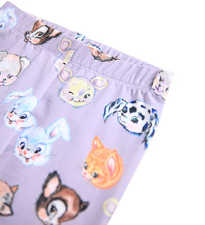 Colorful Molo leggings with a cute animal print in various pastel on a light purple background. The Molo leggings have an elastic waist that ensures a good fit.